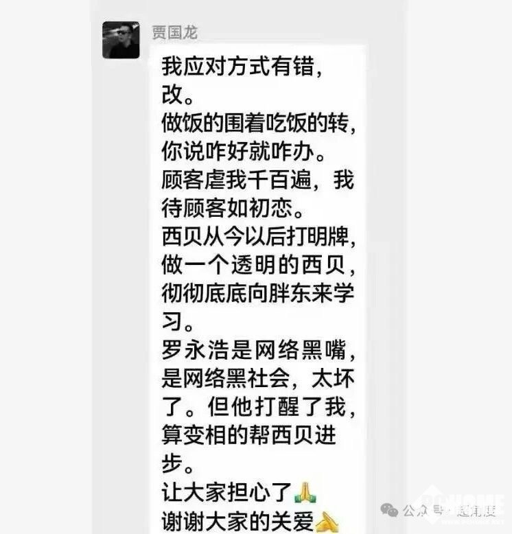 贾国龙在朋友圈表示,自身应对方式存在问题,会加以改正,强调要以顾客为中心,遵循“做饭的围着吃饭的转,你说咋好就咋办”的原则,秉持“顾客虐我千百遍,我待顾客如初恋”的服务理念。同时,贾国龙表示西贝今后将“打明牌”,致力于成为透明的企业,并且会“彻彻底底向胖东来学习”。对于罗永浩,他称其为“网络黑嘴”“网络黑社会”,认为其“太坏了”,但也承认罗永浩的言论“打醒了自己”,算是变相帮助西贝进步。