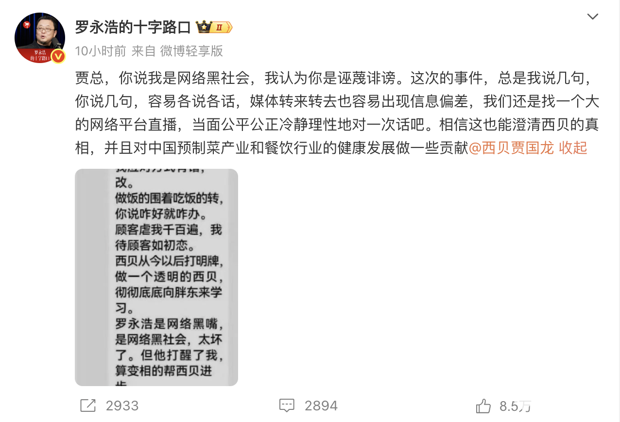 罗永浩在社交媒体发文称,“贾总,你说我是网络黑社会,我认为你是诬蔑诽谤。”此外,罗永浩还邀请贾国龙字找一个大的网络平台直播,当面公平公正冷静理性地对一次话。