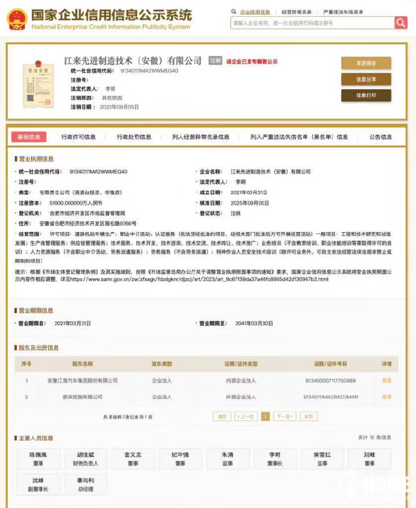 9月15日,国家企业信用信息公示系统最新信息显示,江来先进制造技术(安徽)有限公司现已注销。该公司由蔚来控股有限公司与安徽江淮汽车集团股份有限公司于2021年3月共同成立,注册资本5.1亿元。