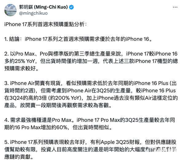2025年9月15日,知名苹果分析师郭明錤发布了对iPhone 17系列首周末预购数据的重点分析。他指出,iPhone 17系列首周末预购需求优于去年的iPhone 16。从第三季总生产量来看,iPhone 17的Pro Max、Pro与标准版较去年同期的iPhone 16多约25%,但出货时间仅增加约一周,这意味着这三款iPhone 17机型的总预购需求较好。