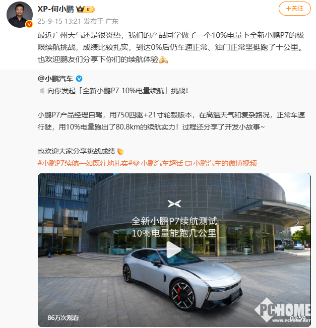 2025年9月15日消息,小鹏汽车董事长何小鹏发文称,小鹏P7产品经理进行了一次“10%电量下全新小鹏P7的极限续航挑战”,驾驶一辆750四驱+21寸轮毂版本,在广州高温天气和复杂路况,正常车速行驶,用10%电量跑了80.8km续航表现。