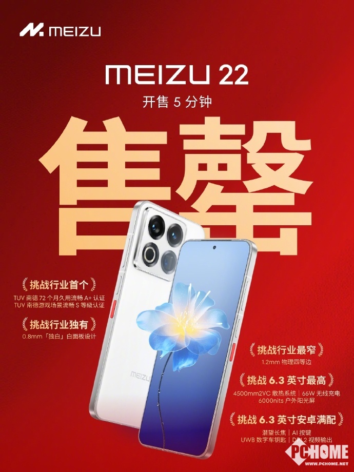 9月15日,在今日举办的魅族22旗舰手机暨FlymeAIOS生态发布会中,魅族22正式发布,定价2999元起。据魅族科技官方消息,魅族22新品上市成绩斐然,开售仅5分钟,便陆续售罄。