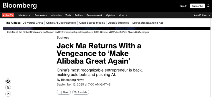 2025年9月16日,彭博社援引知情人士消息称,马云已开始重返阿里巴巴园区,在公司事项中的直接参与度达到了五年来最高。知情人士称,自2019年卸任董事局主席以来,目前是61岁的马云最“亲力亲为”的时候。