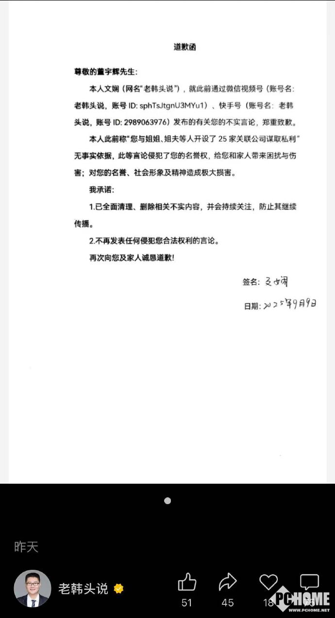 昨日,自媒体账号“老韩头说”运营者(本名:文娴)通过社交平台发布致歉信,就其此前针对董宇辉发布的不实言论公开道歉。道歉信中承认,其通过微信视频号及快手平台发布的所谓“董宇辉与姐姐、姐夫等人开设25家关联公司谋取私利”等内容毫无事实依据,对董宇辉的名誉权造成侵害,并对其本人、家人及社会形象造成严重损害。