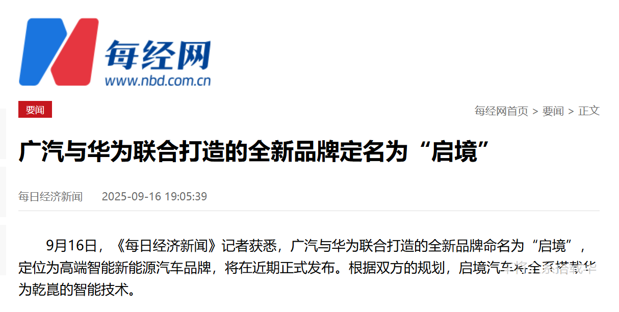 9月16日,据每日经济新闻报道,广汽与华为联合打造的全新高端智能新能源汽车品牌正式定名为“启境”,该品牌将在近期正式发布。