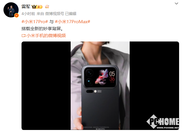 9月17日,小米董事长雷军发布视频,首次展示了小米17 Pro的背屏设计。视频中,17 Pro机身后置一块可自定义的背屏,配合双摄镜头及闪光灯布局,可用于显示时钟、个性化图案,还能实现后摄自拍预览和车控等功能。