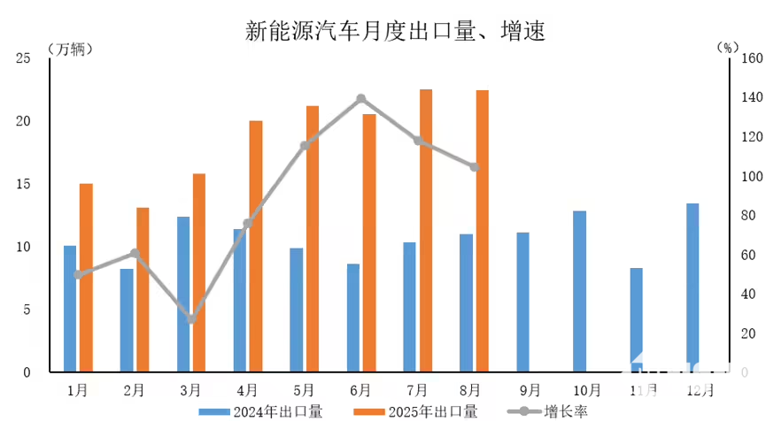 8月份新能源汽车出口22.4万辆,同比实现翻番,虽环比微降0.6%,但总体仍处高位运行。今年前8个月累计出口153.2万辆,同比增长87.3%,成为推动整体市场扩张的重要力量。