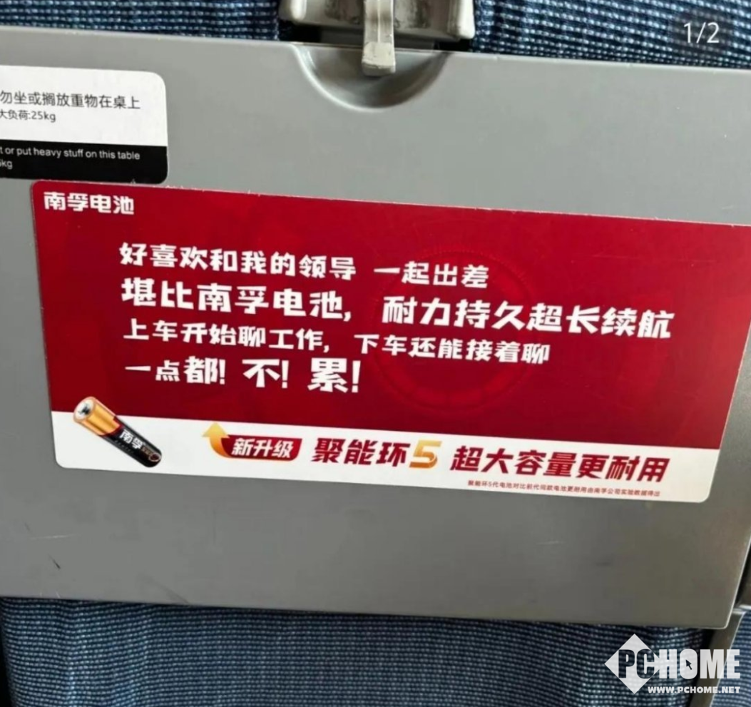 近日,一则出现在高铁座椅小桌板上的南孚电池广告语意外引发舆论热议。广告内容写道:“好喜欢和我的领导一起出差,堪比南孚电池,耐力持久超长续航,上车开始聊工作,下车还能接着聊,一点都!不!累!”——原本意在凸显产品“续航持久”的卖点,却因语境特殊,被不少网友解读出“上班族职场精神状态”的反讽意味。