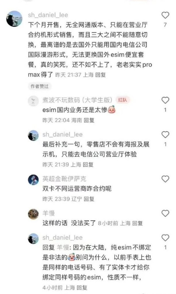 据了解,中国移动目前已上线eSIM相关业务,但尚未完全开放。中国联通虽可办理相关业务,但针对iPhone Air这款手机,目前仍处于适配阶段。而中国电信,当前仅有广东、四川、安徽和江西四个省份的线下营业厅支持办理,其他地区正在恢复中。