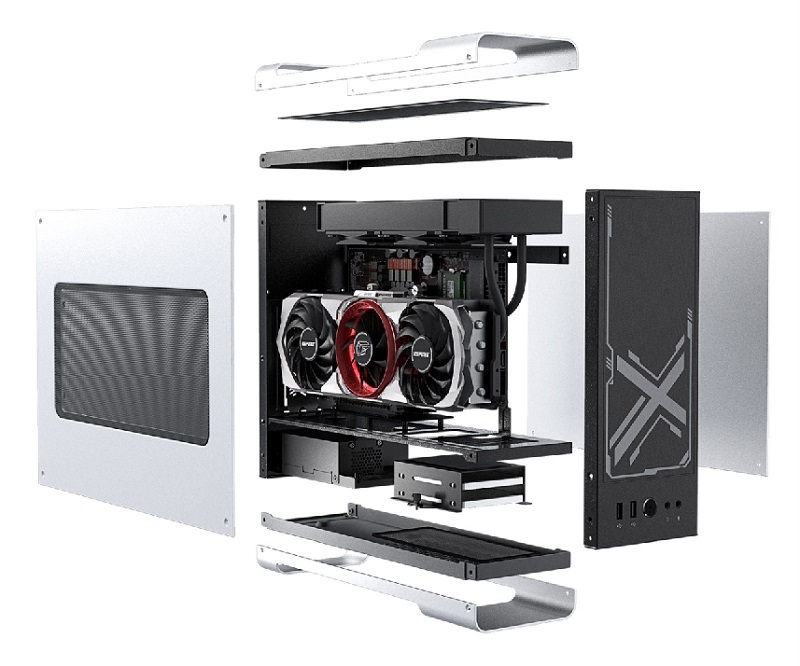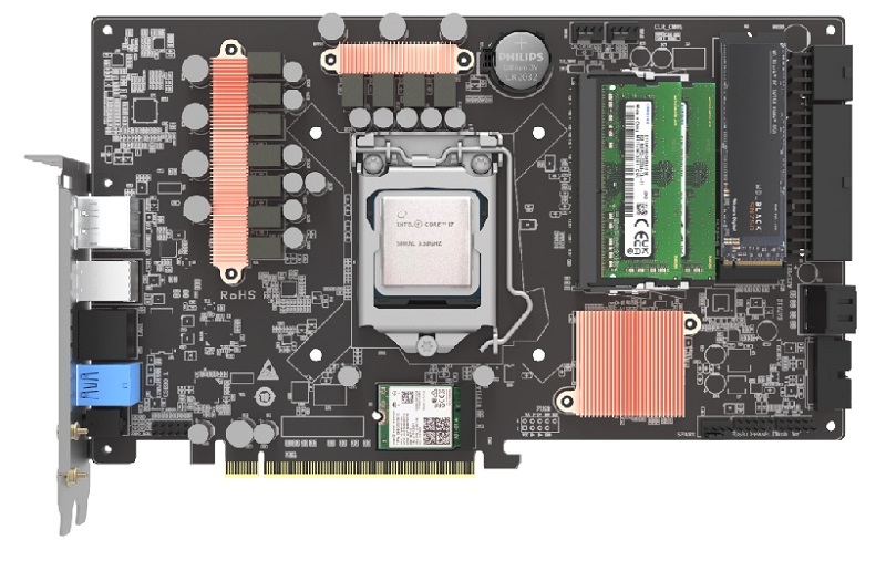 DEAMINI新款迷你准系统的主板采用了NUC架构的英特尔Z590芯片组,是竖插+硬桥的结构,仅有双槽厚度,即便加上双槽厚度的显卡,总共也只占有四槽的宽度,这也是该准系统最大的特色。