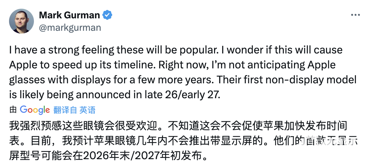 作为长期追踪苹果生态的权威人士,古尔曼同时表达了对该产品市场潜力的信心,直言“强烈预感这些眼镜会很受欢迎”,并猜测市场热度或可能推动苹果调整原有的发布时间表。