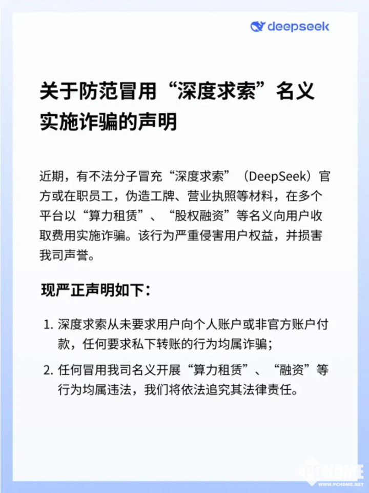 对此,DeepSeek发布严正声明。声明中明确指出,深度求索从未要求用户向个人账户或非官方账户付款,任何要求私下转账的行为均属诈骗。同时强调,任何冒用该公司名义开展“算力租赁”“融资”等行为均属违法,DeepSeek将依法追究相关违法者的法律责任。 近年来,随着人工智能行业的蓬勃发展,各类诈骗手段也层出不穷,给企业和用户都带来了不小的困扰。