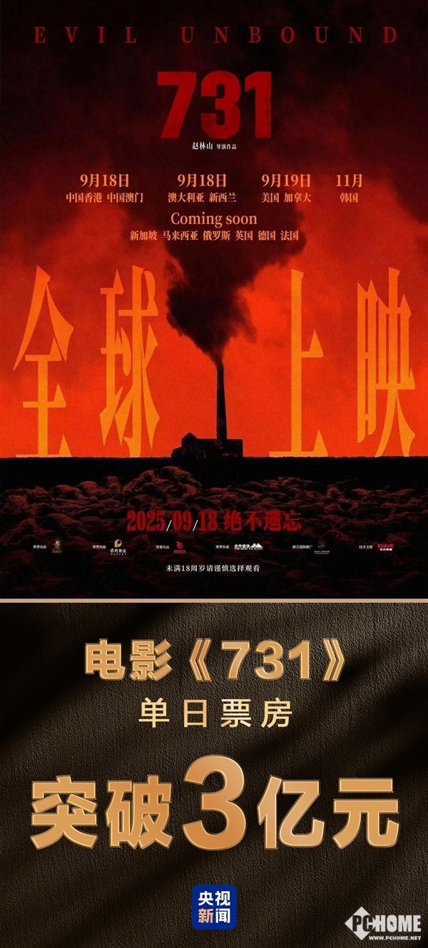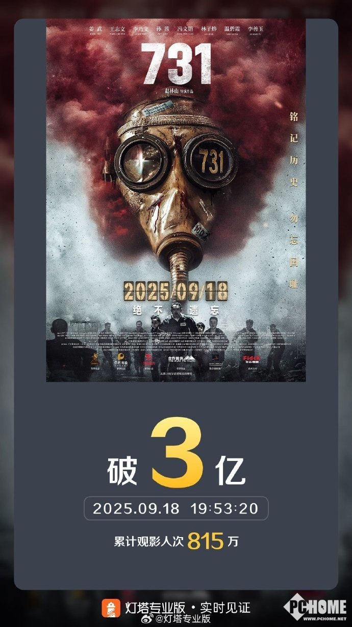 9月18日,铭记历史、警示后人的电影《731》在全球震撼上映。截至当日19时53分,《731》单日票房强势突破3亿大关,成功刷新中国影史票房纪录,同时荣膺中国影史单片单日总场次榜冠军,展现出非凡的票房号召力。
