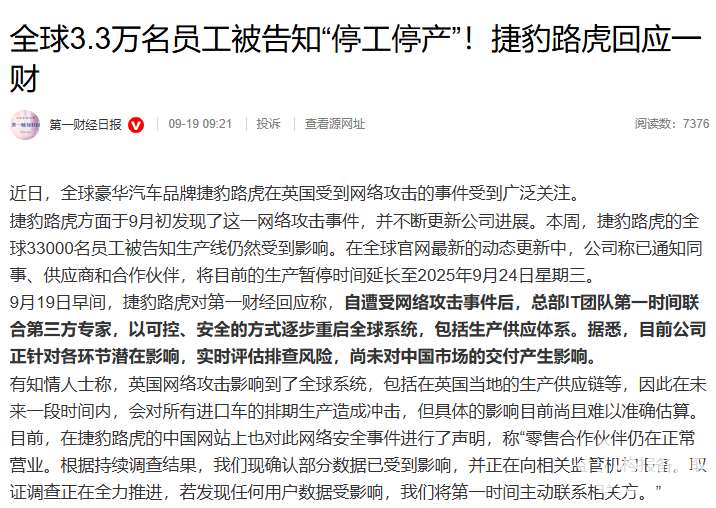 2025年9月19日消息,据第一财经报道,今年9月初,英国汽车制造商捷豹路虎(Jaguar Land Rover)官网宣布,因遭遇网络攻击事件,导致车辆装配线陷入停滞。公司决定将停产时间延长至9月24日,捷豹路虎全球3.3万名员工被告知生产线仍然受到影响。