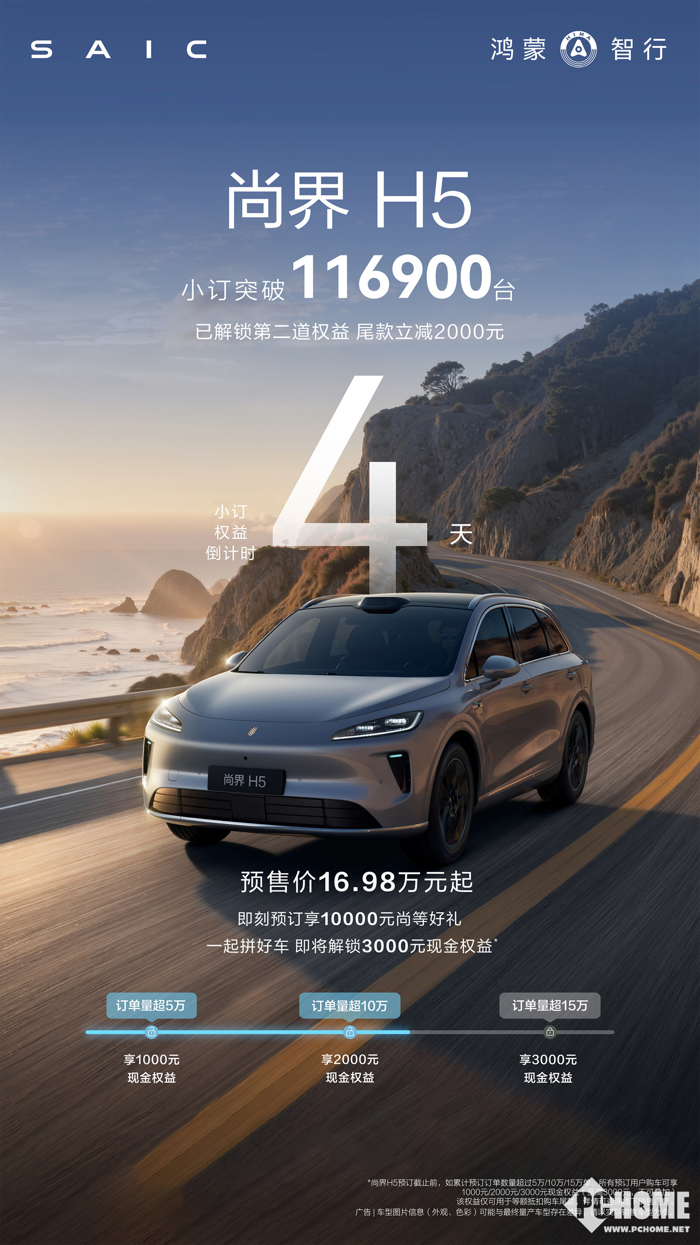 尚界汽车官宣,尚界H5小订突破11万台,达116900台,已解锁2000元专属现金权益,订单量超15万将解锁3000元现金权益。