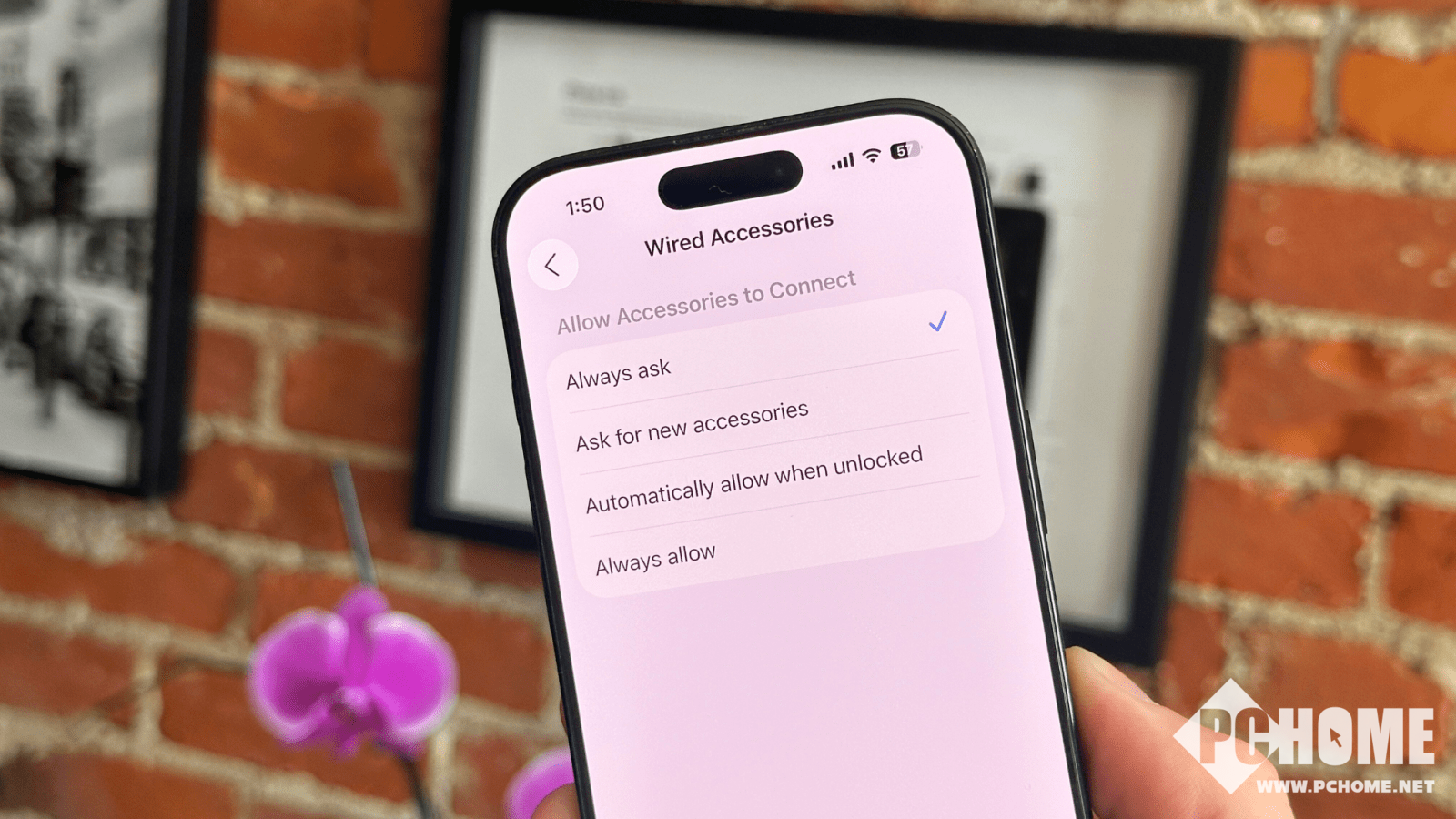 此外,用户可在“设置 > 隐私与安全 > 有线配件”中自定义权限策略,包括“始终询问”“仅询问新配件”“解锁时自动允许”和“始终允许”四种模式。可减少公共场所充电桩或第三方配件中潜在的“juice jacking”(利用充电口进行恶意数据窃取)的安全隐患。