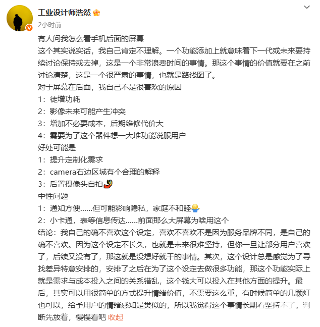 9月22日,OPPO工业设计中心总经理刘浩然在个人社交平台发文,公开表达了自己对手机背部屏幕(即“背屏”)设计的看法。他直言个人并不看好这一方案,并从功耗、成本和用户价值等角度进行了分析。