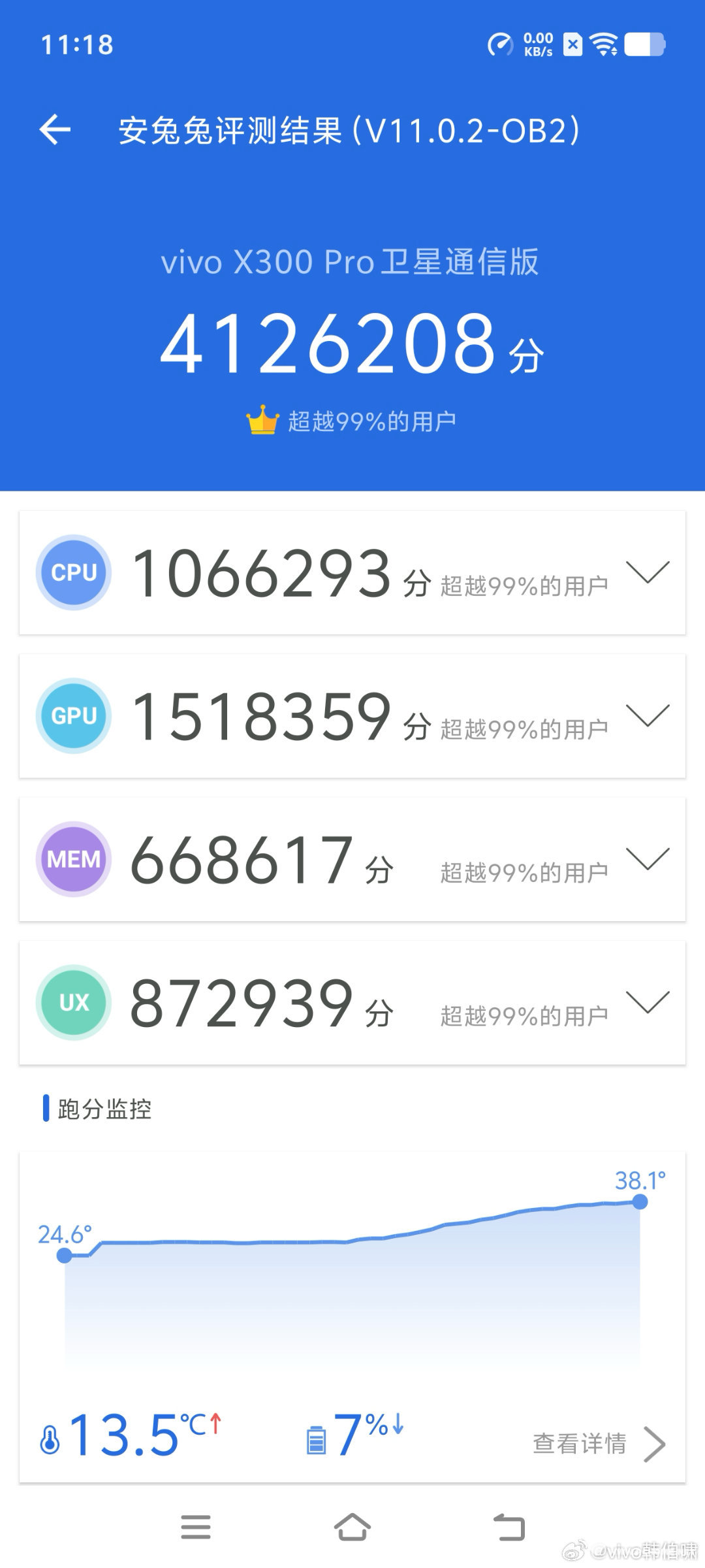 22日下午,vivo产品经理韩伯啸在社交媒体平台曝光了vivo X300 Pro的安兔兔跑分,跑分高达412万+分,温度从24.6℃起步,最高温仅为38.1℃。