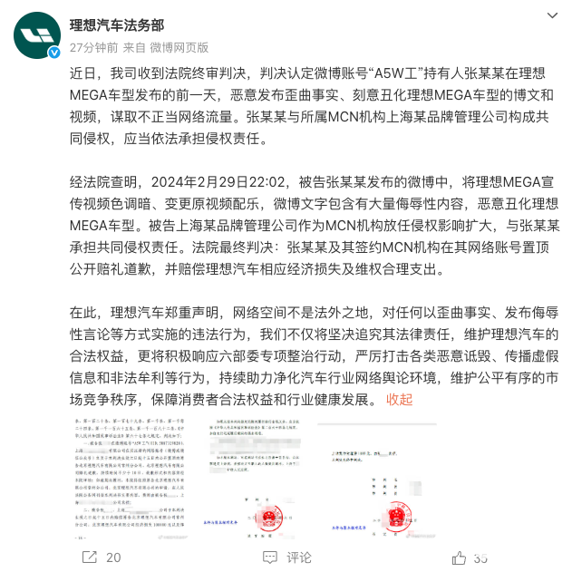 2025年9月22日,理想汽车法务部官微发布消息称,理想MEGA被抹黑一案迎来终审判决。法院判定,此前持续发布不实内容、恶意抹黑理想MEGA的微博账号“A5W工”持有人张某某与所属MCN机构上海某品牌管理公司,需公开向理想汽车道歉,并承担相应经济损失。这一判决为长期以来饱受网络不实言论困扰的理想MEGA带来正义曙光。