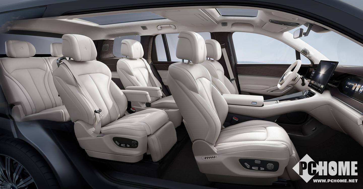 从官方图片可见,新车采用2+2+2六座布局,前排与中排座椅配备多向调节功能,中排设独立扶手,第三排空间相对紧凑。内饰方面搭载三联屏仪表台、双幅方向盘及怀挡换挡机构,并配备手动遮阳帘与车载冰箱。