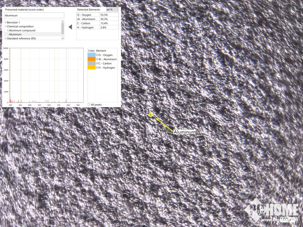 igor's Lab展示了一张iPhone 17 Pro Max机身表面的微观照片,光谱分析显示,其成分约为53.5%氧、30.3%铝、13.4%碳和2.8%氢。极高的氧浓度表明存在氧化铝,通过阳极氧化工艺形成保护层,保护层由多孔的Al₂O₃构成,优点在于增强防刮性,色泽更稳定,有较好的耐腐蚀性。