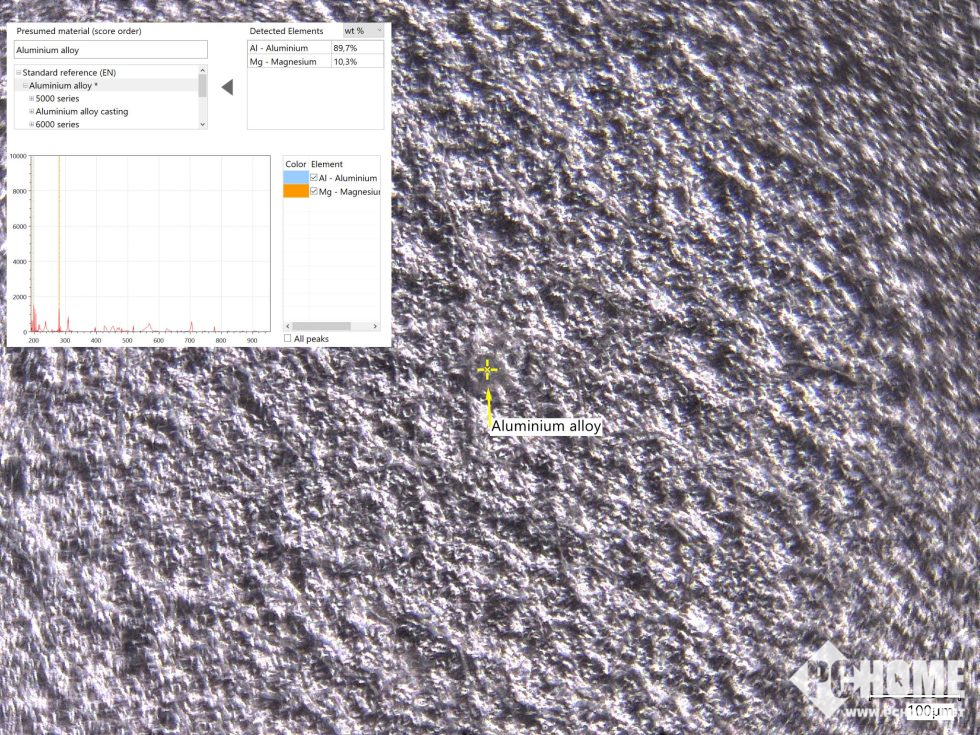 另一张微观照片显示,苹果iPhone 17 Pro Max放弃了多段式钛金属框架,转而采用一体式高镁铝合金材质,分析结果显示,其铝含量约为 89.7%,镁含量约为 10.3%。使得它更为轻巧、耐腐蚀、易于进行阳极氧化工艺。阳极氧化层能提高防腐蚀性,使机身更加耐用。igor's Lab认为,选择此材质应该是苹果公司在成本、材料与性能之间平衡后的结果。