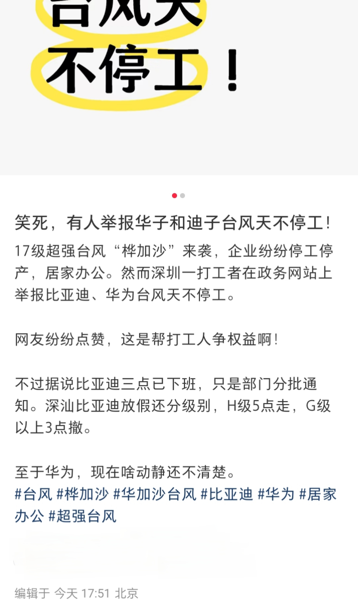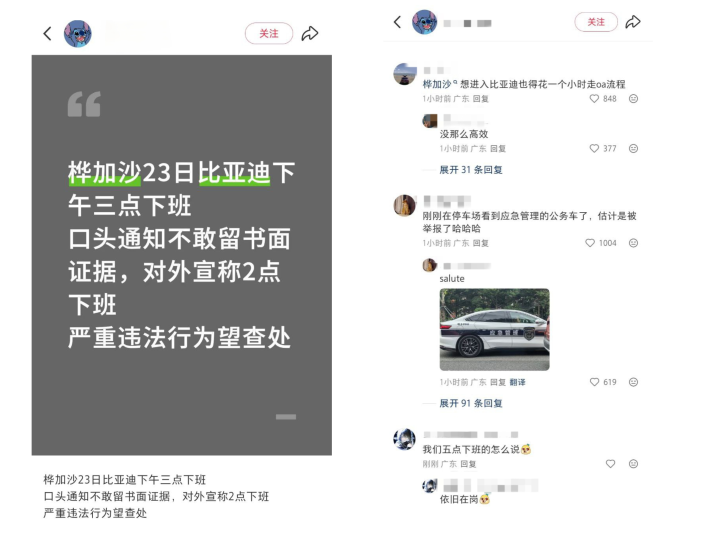 近日,有网友在社交平台爆料称,比亚迪在台风“桦加沙”影响期间采取区别化下班安排:G级员工15时下班,H级员工需工作至17时,且相关通知仅通过口头传达,未留存书面记录,公司对外仍宣称14时下班。