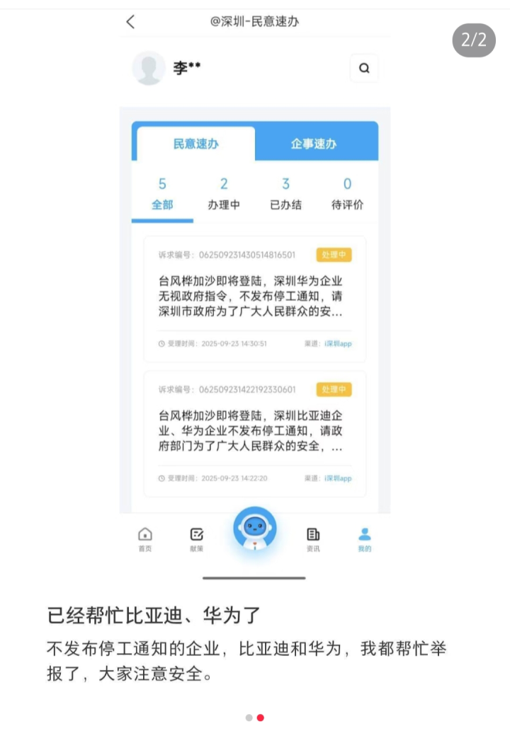 另有图片显示,已有应急管理公务车辆抵达比亚迪停车场,疑似相关部门接获举报后介入调查。在“深圳民意速办”平台,出现多起针对比亚迪台风天未按规定停工的实名举报,目前状态显示为“处理中”。