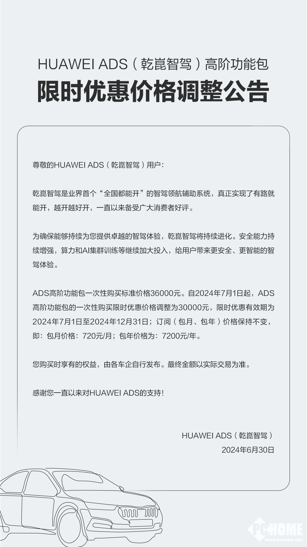 有网友推测,李想似乎是在内涵华为。与理想汽车的高阶辅助驾驶采取免费策略不同,用户若要使用华为ADS,需缴纳一定的费用。按最新的公告,华为ADS高阶功能包一次性购买30000元,年卡7200元/年,月卡720元/月。价格有效期为2025年7月1日至2025年12月31日。正常情况下,华为ADS高阶功能包一次性购买为36000元,年卡7200元/年,月卡720元/月。