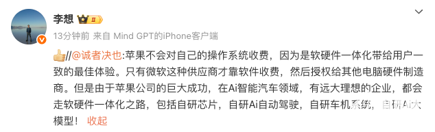 对此,有网友回应称,“苹果不会对自己的操作系统收费,因为是软硬件一体化带给用户一致的最佳体验。只有微软这种供应商才靠软件收费,然后授权给其他电脑硬件制造商。但是由于苹果公司的巨大成功,在AI智能汽车领域,有远大理想的企业,都会走软硬件一体化之路,包括自研芯片,自研AI自动驾驶,自研车机系统,自研AI大模型!”该评论获得了李想的点赞。