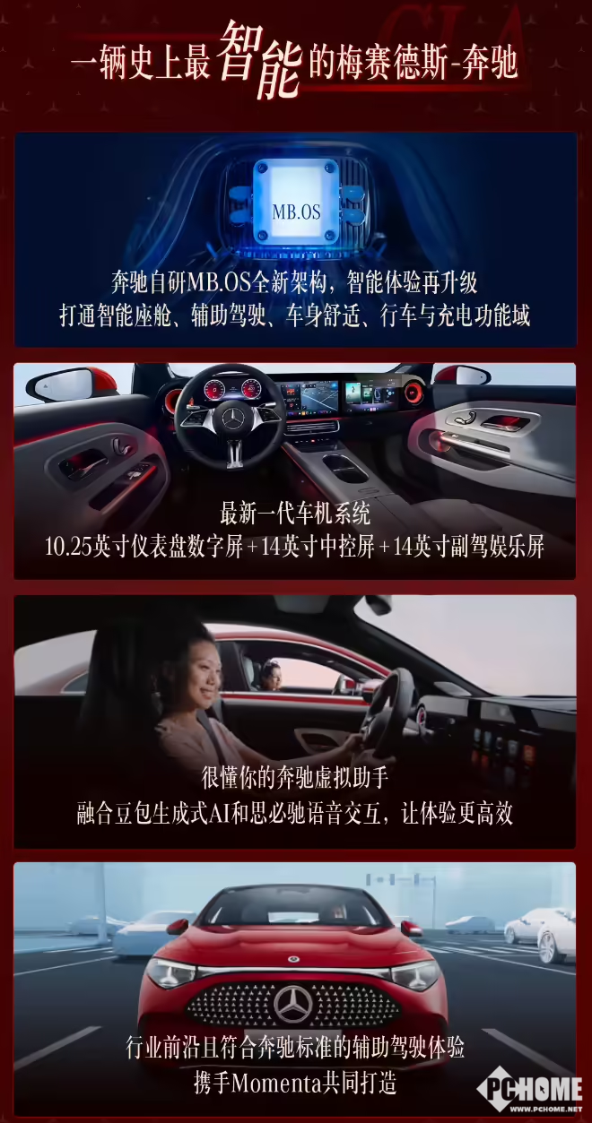 全新CLA首次搭载奔驰自研的MB.OS架构,整合智能座舱、辅助驾驶、车身舒适、行车与充电等功能域,车机系统包含10.25英寸仪表盘、14英寸中控屏和14英寸副驾娱乐屏。车载虚拟助手融合豆包生成式AI与思必驰语音交互技术,并支持与Momenta联合开发的驾驶辅助功能。