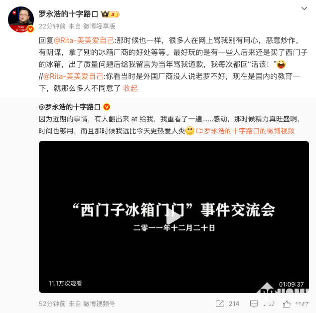对此,有网友评论称,“你看当时是外国厂商没人说老罗不好,现在是国内的教育一下,就那么多人不同意了。”罗永浩则回应称:那时候也一样,很多人在网上骂我别有用心,恶意炒作,有阴谋,拿了别的冰箱厂商的好处等等。最好玩的是有一些人后来还是买了西门子的冰箱,出了质量问题后给我留言为当年骂我道歉,我每次都回“活该!”