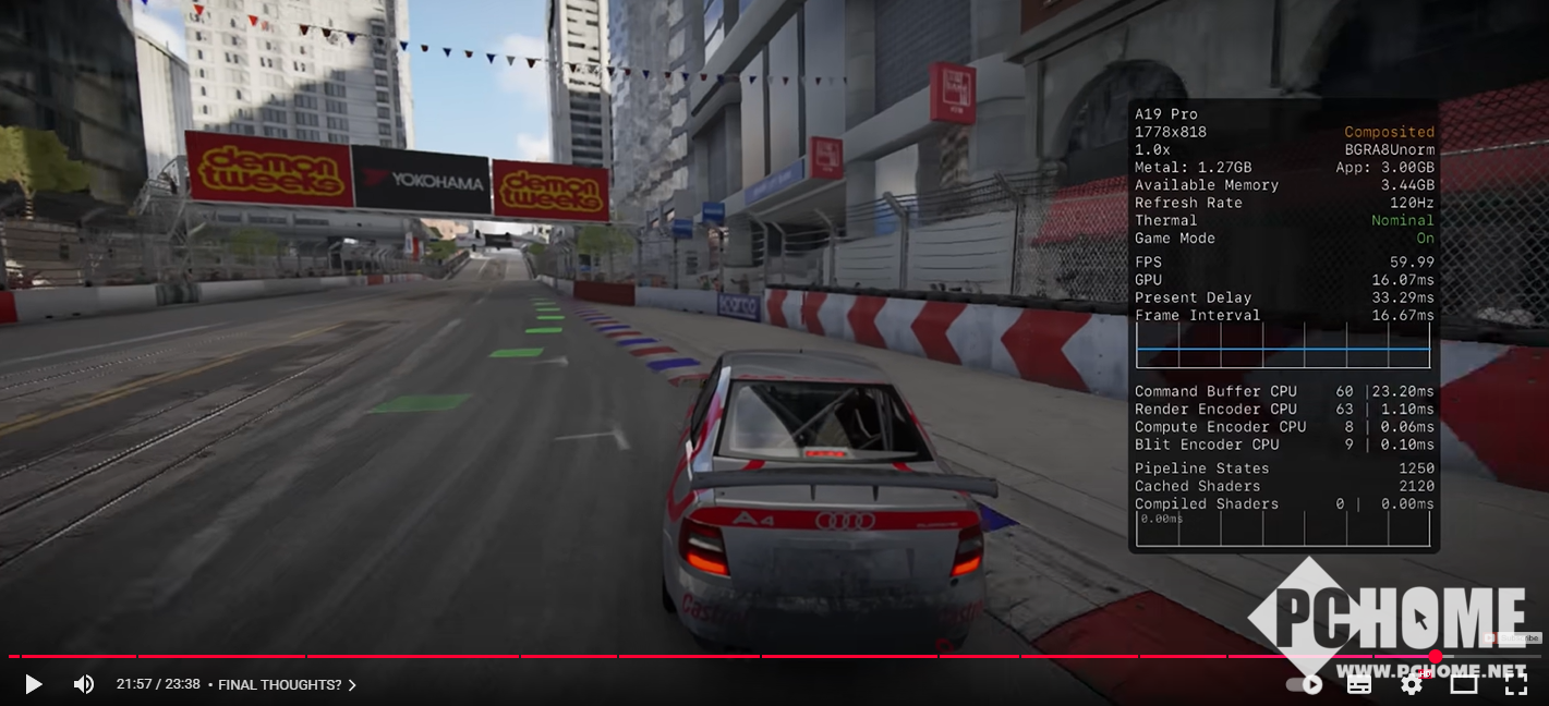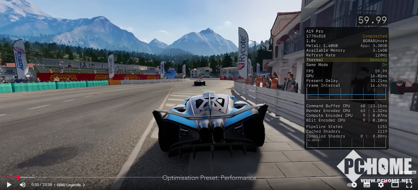 MrMacRight表示,iPhone 17 Pro Max表现相当不错,在短时间使用的情况下,游戏基本可以稳定30至60帧,部分游戏可以尝试60帧以上。像《超级房车赛传奇》游戏测试时,iPhone 17 Pro Max在性能模式下,在1778×818分辨率稳定运行60帧,且温度表现良好。