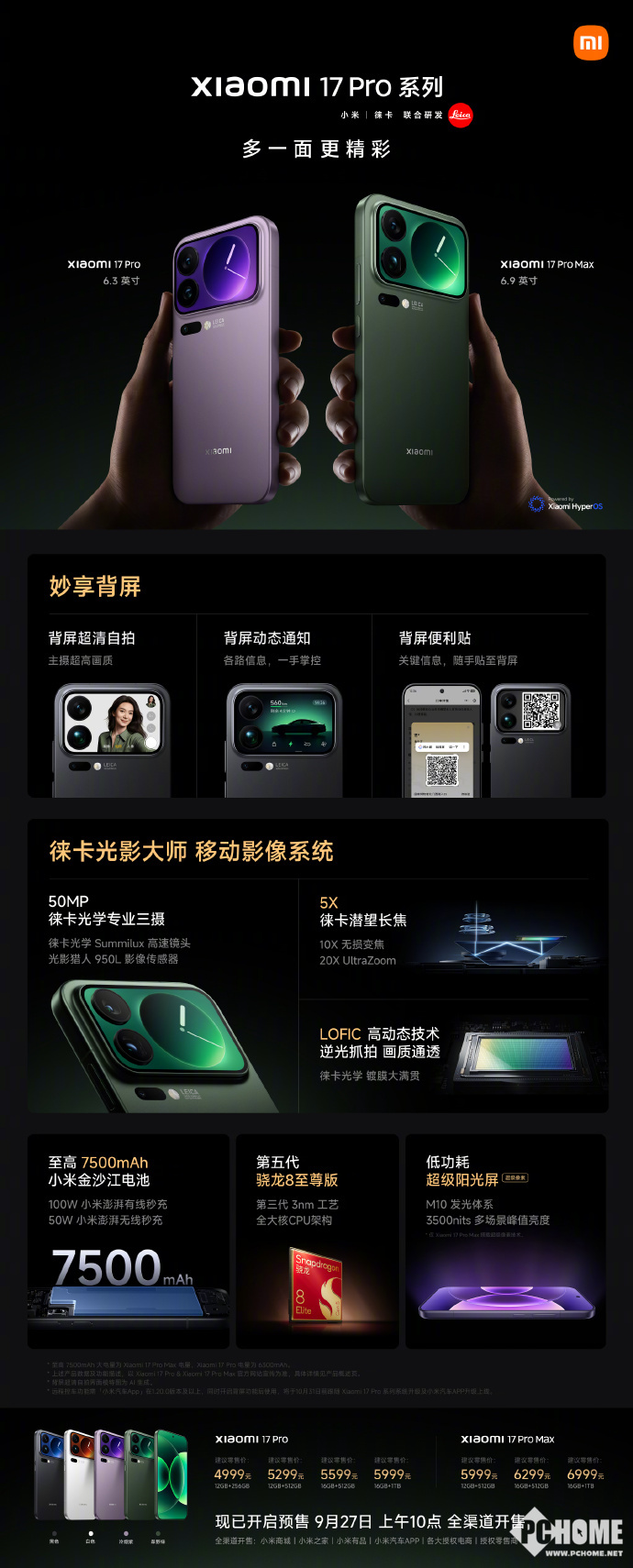 9月25日,小米今日举行的新品发布会上推出定位“小尺寸影像旗舰”的小米17 Pro,以12GB+256GB版本4999元起售,同步开启预售,9月27日上午10点正式开售。