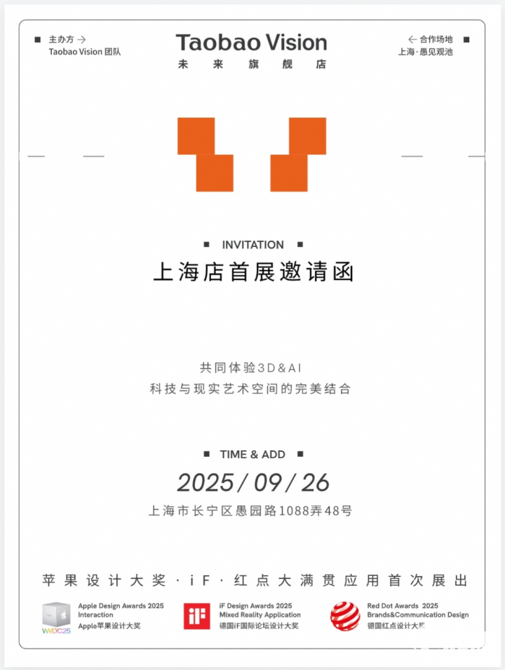 据悉,淘宝Vision未来旗舰店上海首店,位于海市长宁区愚园路1088弄48号,9月26日上海店首展邀请函已经发出。据业内人士透露,今年6月,淘宝Vision未来旗舰店首家概念店已经在阿里巴巴总部试运行,首批展示了小米SU7虚拟试车、智能家居等场景。