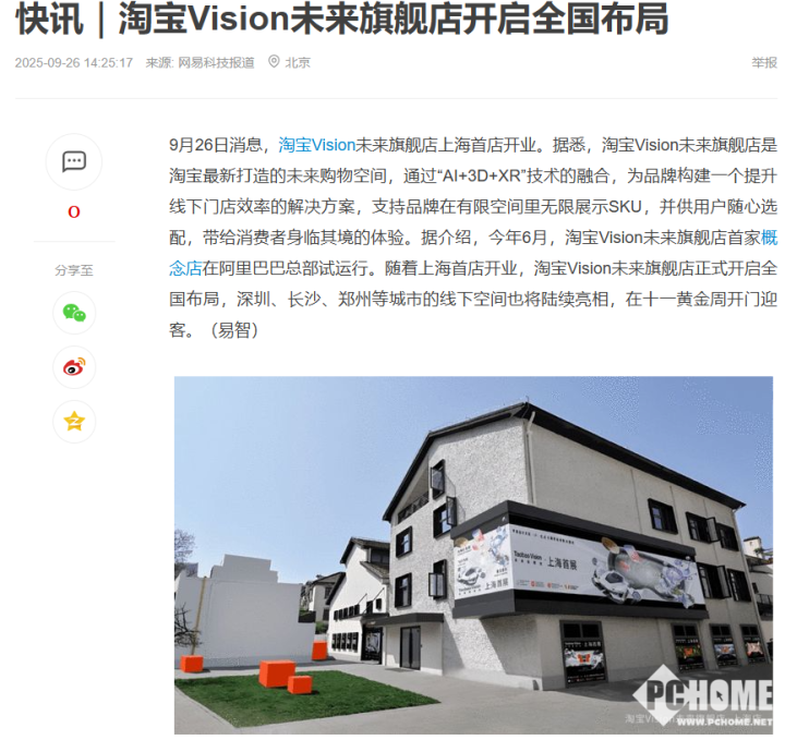 2025年9月26日消息,据网易科技,淘宝Vision未来旗舰店在上海开业,打造未来购物空间,通过利用“AI+3D+XR”技术融合,为消费者构建一个沉浸式购物体验空间,在有限的空间内挑选无限的商品“云逛街”,带给消费者身临其境的体验。