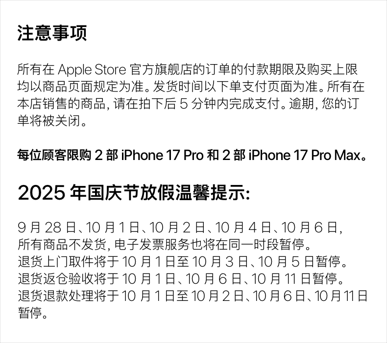 临近2025年国庆假期,天猫Apple Store官方旗舰店发布了放假相关通知,涉及商品发货、电子发票及退货等多项服务的调整,其中iPhone 17系列等商品在9月28日、10月1日、10月2日、10月4日、10月6日这五天将暂停发货。
