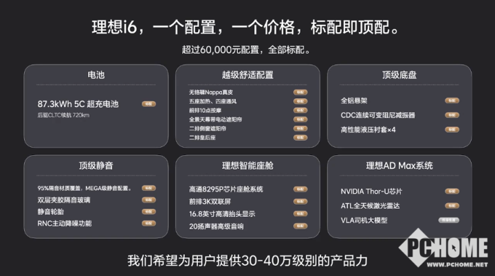 理想汽车召开新品发布会,正式发布了五座中大型纯电SUV理想i6,全系只有一个标配配置,24.98万元。首销期下单理想i6,赠送价值3.5万元的权益,包括1万元现金减免、1.5万元双腔空悬、5000元冷暖箱、5000元电吸门。