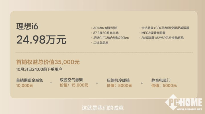 2025年9月26日,理想汽车召开新品发布会,正式发布了五座中大型纯电SUV理想i6,全系只有一个标配配置,24.98万元。首销期下单理想i6,赠送价值3.5万元的权益,包括1万元现金减免、1.5万元双腔空悬、5000元冷暖箱、5000元电吸门。
