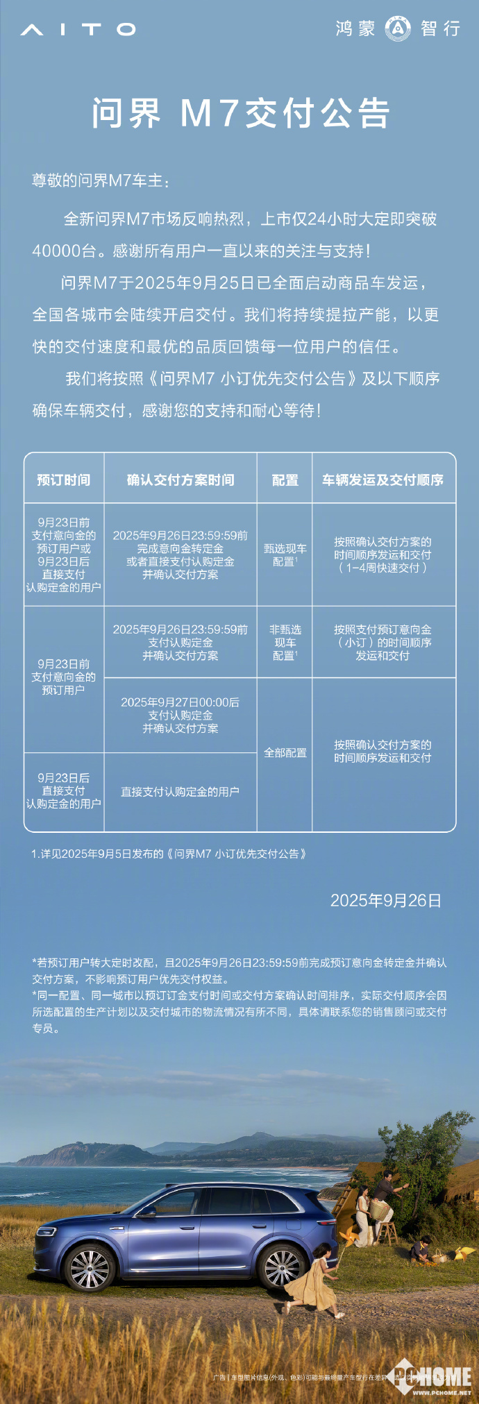 据悉,新M7在上市24小时内获得超过4万台大定订单,市场反响强烈。为保障交付效率,官方制定了按预订时间及配置优先级的交付顺序:9月26日前完成定金支付并确认交付方案的用户可优先安排发运,后续订单则按确认时间排序处理。