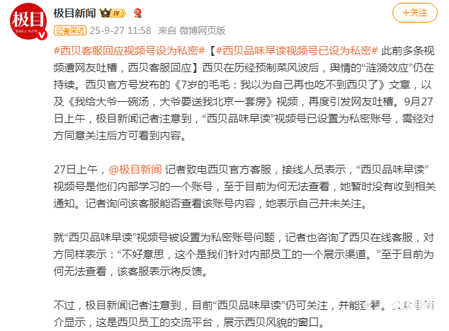 据极目新闻,发布该视频的西贝官方认证账号“西贝品味早读”,账号已设置为私密账号,需经对方同意关注后方才可查看内容。客服回应称,是真人真事,之前发布的,不是近期的。该公众号主要是和西贝员工交流互动的。至于涉事店长是不是15岁就在西贝上班,客服人员表示不清楚。