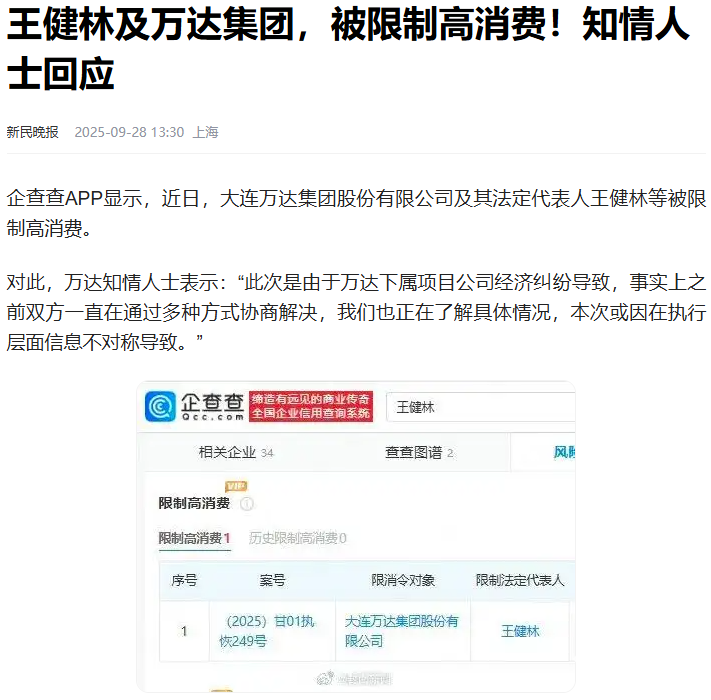 2025年9月28日消息,据新民晚报报道,近日,大连万达集团股份有限公司及其法定代表人王健林等被限制高消费,相关案件执行标的为1.86亿元,大连万达集团股份有限公司、万达地产集团有限公司等因此案被强制执行,执行法院为甘肃省兰州市中级人民法院。