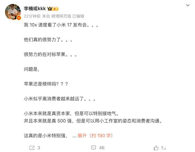 2025年9月28日,前魅族科技副总裁、Angry Miao创始人、财经观察官李楠在社交媒体发文称,自己十倍速看完了小米17发布会,表示,“他们真的很努力了,很努力的在对标苹果。问题是,苹果还是榜样吗?小米似乎离消费者越来越远了。”