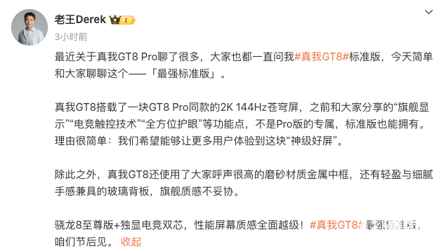 2025年9月28日,真我realme中国区总裁徐起官宣真我GT8标准版,该产品的核心卖点是,“挑战最强标准版”。