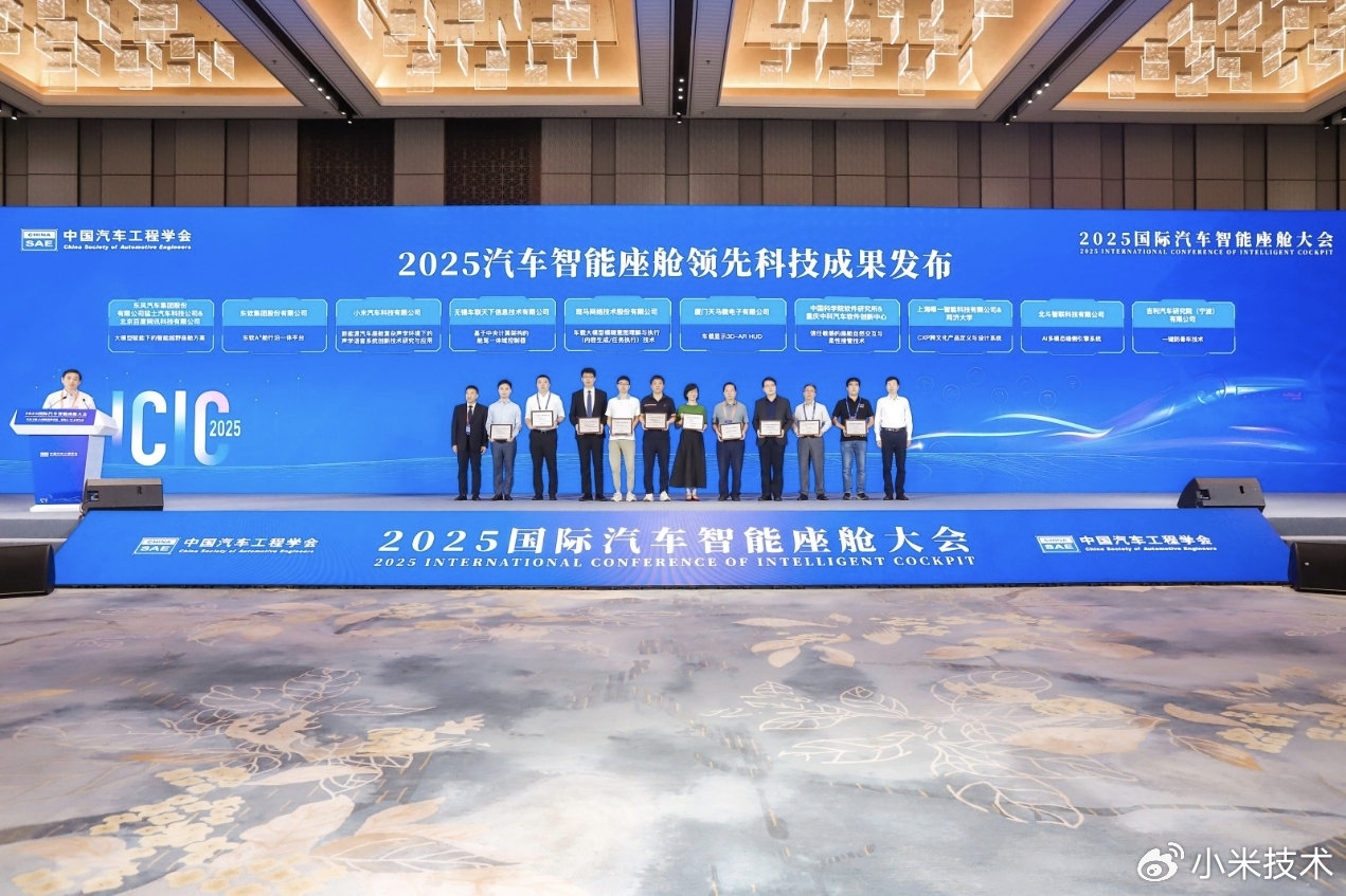 2025年9月28日消息,近日,在由中国汽车工程学会和江苏省科学技术协会联合主办的2025国际汽车智能座舱大会(ICIC 2025)上,小米汽车荣获“ 2025 汽车智能座舱领先科技成果”奖项。