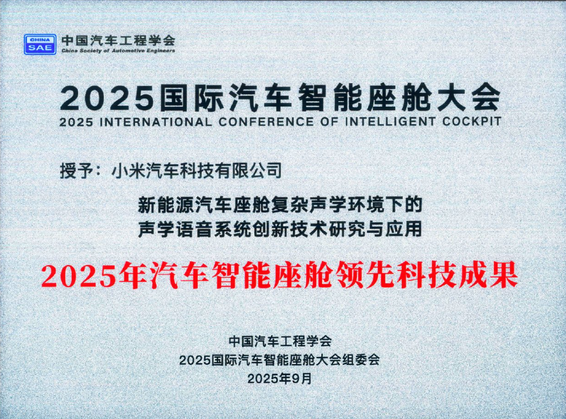 据介绍,由小米汽车申报的《新能源汽车座舱复杂声学环境下的声学语音系统创新技术研究与应用》荣获“ 2025 汽车智能座舱领先科技成果”奖项,小米汽车在研发过程中,依托深耕电子消费产品多年积累的大量自研技术与创新,打造了精准适配座舱复杂声学环境的声学语音系统。