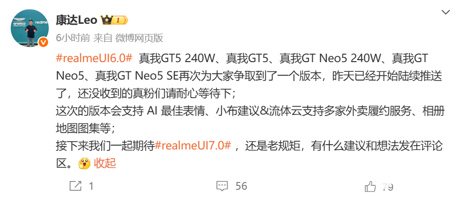 9月28日,realme UI产品经理“康达Leo”发文回应用户期待,称真我GT5 240W、GT Neo5 SE等多款机型“再次争取到一个版本”,已于9月27日启动灰度推送,全量覆盖预计需2-3周。此次追加更新打破常规维护周期,引发老用户群体热议。