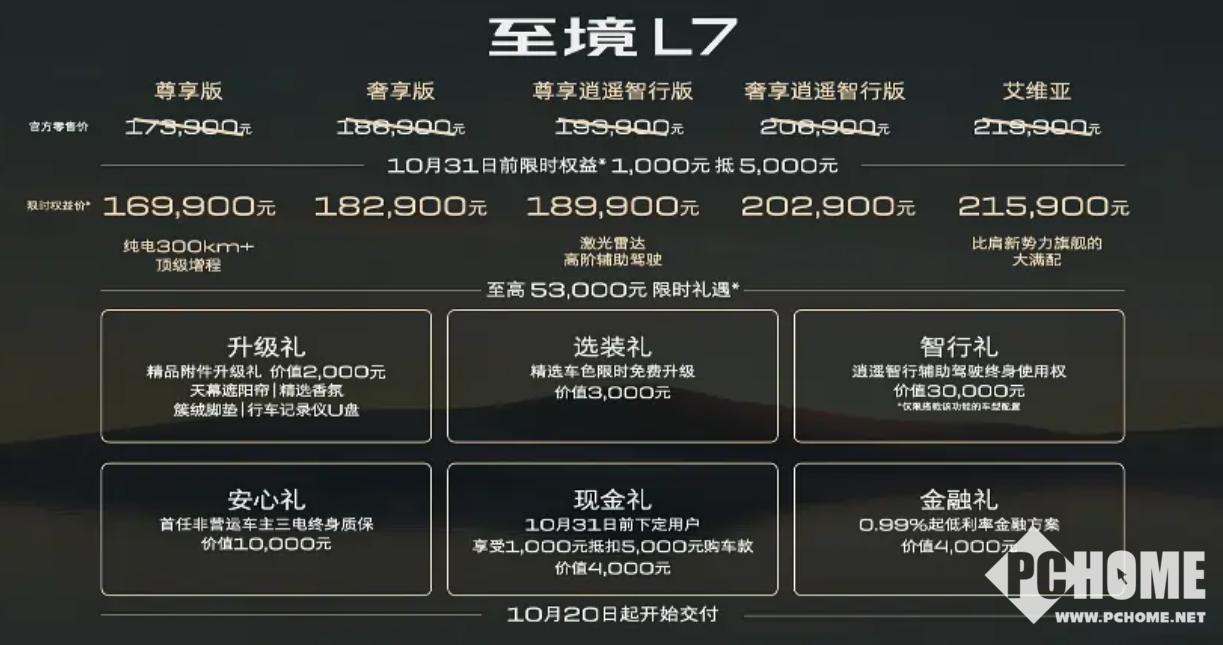 9月28日,别克高端新能源子品牌“至境”首款车型至境L7正式上市,推出5款配置车型,官方指导价17.39万元-21.99万元,10月31日前享限时权益价16.99万元-21.59万元。