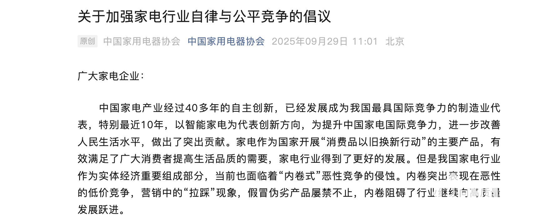 2025年9月29日,中国家用电器协会发布《关于加强家电行业自律与公平竞争的倡议》,直指当前家电行业“内卷式”恶性竞争痛点,明确将杜绝无序低价竞争、禁止低于成本价倾销列为核心举措,为行业高质量发展划定红线。