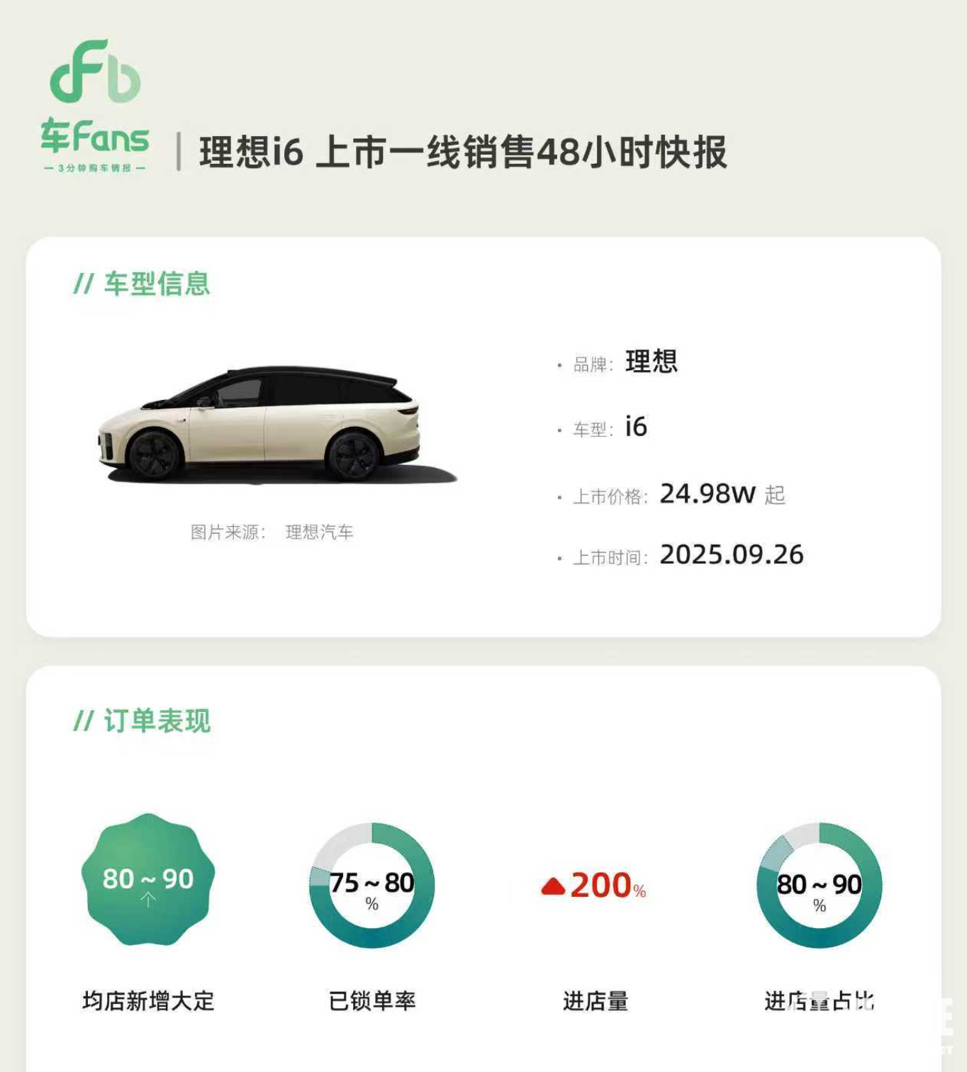 2025年9月29日,汽车博主“孙少军”披露了理想i6上市一线销售48小时快报,均店新增大定量达80-90台,锁单率高达75%-80%,进店量同比提升200%,尤其在东区一二线城市表现亮眼。